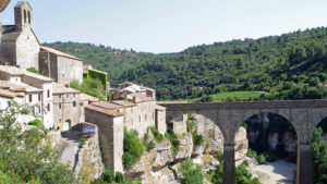 Minerve, the ancient capital of Minervois, sits atop a rocky outcrop at the junction of the Cesse and Brian Rivers, and is many consider it to be the quintessential medieval village. First founded in the 8th century, it is surrounded by deep limestone gorges and offers magnificent views of the countryside. Along the riverbed are caves and bridges carved out of limestone by the power of the water. An octagonal tower, “La Candela,” is all that remains of the medieval castle. It is famously remembered as the site of the first mass burning of Cathar heretics during the Albigensian Crusade of the 13th century. A small museum in the center of the village recalls this gruesome chapter of its history. The 10th century Church of St-Stephen contains a 5th-century altar, thought to be one of the earliest Christian altars in Europe. It is inscribed with the initials and names of the inhabitants of the town who swore to God they would pay their taxes while under Visigoth rule.